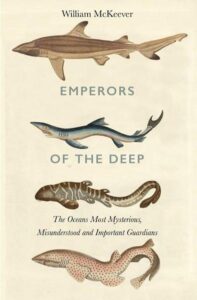 Originally published by Harper Collins in a US edition in June of 2019, the cover of William McKeever‘s Emperors of the Deep; Sharks; The Ocean’s Most Mysterious, Most Misunderstood, and Most Important Guardians depicts a sharply defined photographic image of a shark as it swims boldly yet smoothly through its aquatic realm. The cool filtered blue light of the epipelagic (sunlight zone) ocean layer surrounds the unmistakable strongly upright tail of a shark prominently featured in the foreground as it swims away from the observer’s perspective. The iconic triangular dorsal fin, being farther from the viewer, gives the feeling of at least momentary safety while still imparting the chilling thought that the shark could still turn around at any moment. Dramatic in its composition, perhaps even reasonably described as cinematic (which, as one of its author’s principle media is film) it is an image that would be expected to appeal to the thrill of sharks, but not – thankfully – in a manner that merely panders to all-too-common misunderstandings of these creatures (as are, alas, too many popular presentations of them).